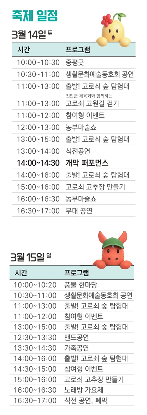 청춘불판, 찐빵체험, 고로쇠 달고나 만들기, 초코분수, 고로쇠 주전부리, 읍·면 로컬푸드 등