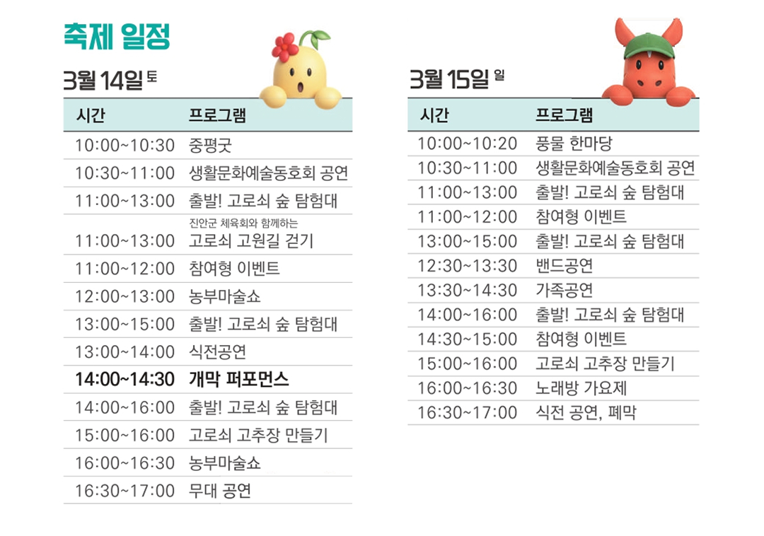 청춘불판, 찐빵체험, 고로쇠 달고나 만들기, 초코분수, 고로쇠 주전부리, 읍·면 로컬푸드 등
